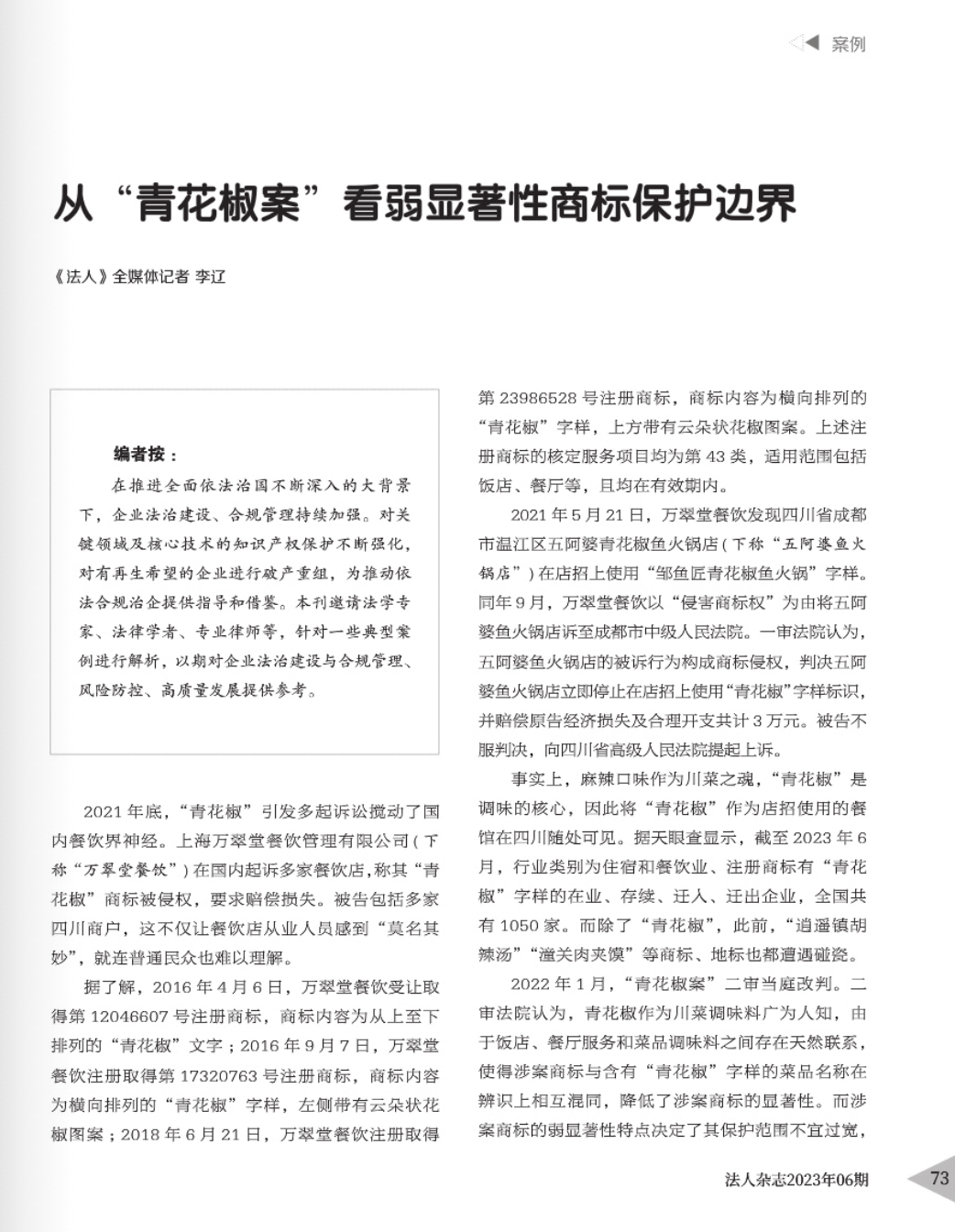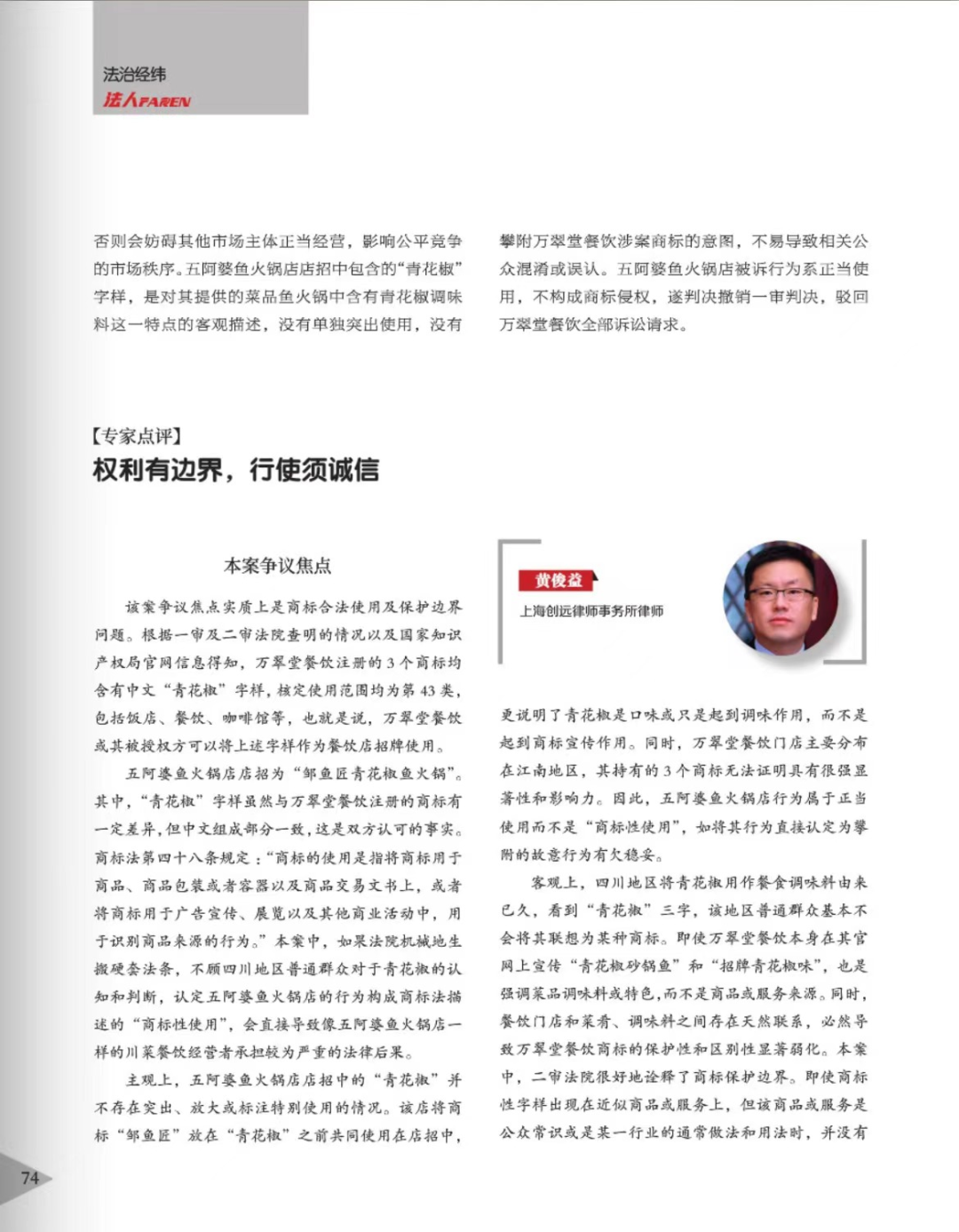浙江辉知简讯 | 辉知队黄俊益律师应“法治日报”旗下杂志邀请,就“青花椒”案发表专家点评